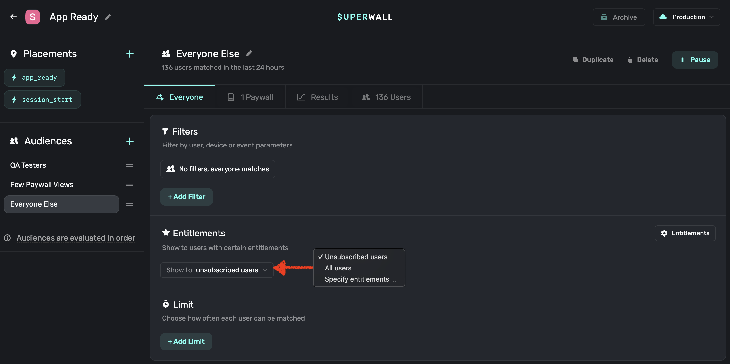 In the Paywall Editor you can choose whether to always present a paywall or ask the SDK to check the user subscription before presenting a paywall. For users on v2 of the SDK, this is replaced with a check on the entitlements within the audience filter. As you migrate your users from v1 to v2 of the SDK, you'll need to make sure you set both the entitlements check and the paywall presentation condition in the paywall editor.