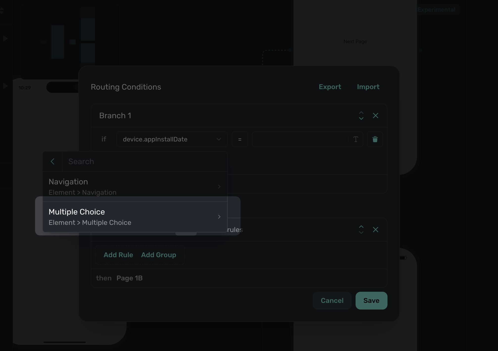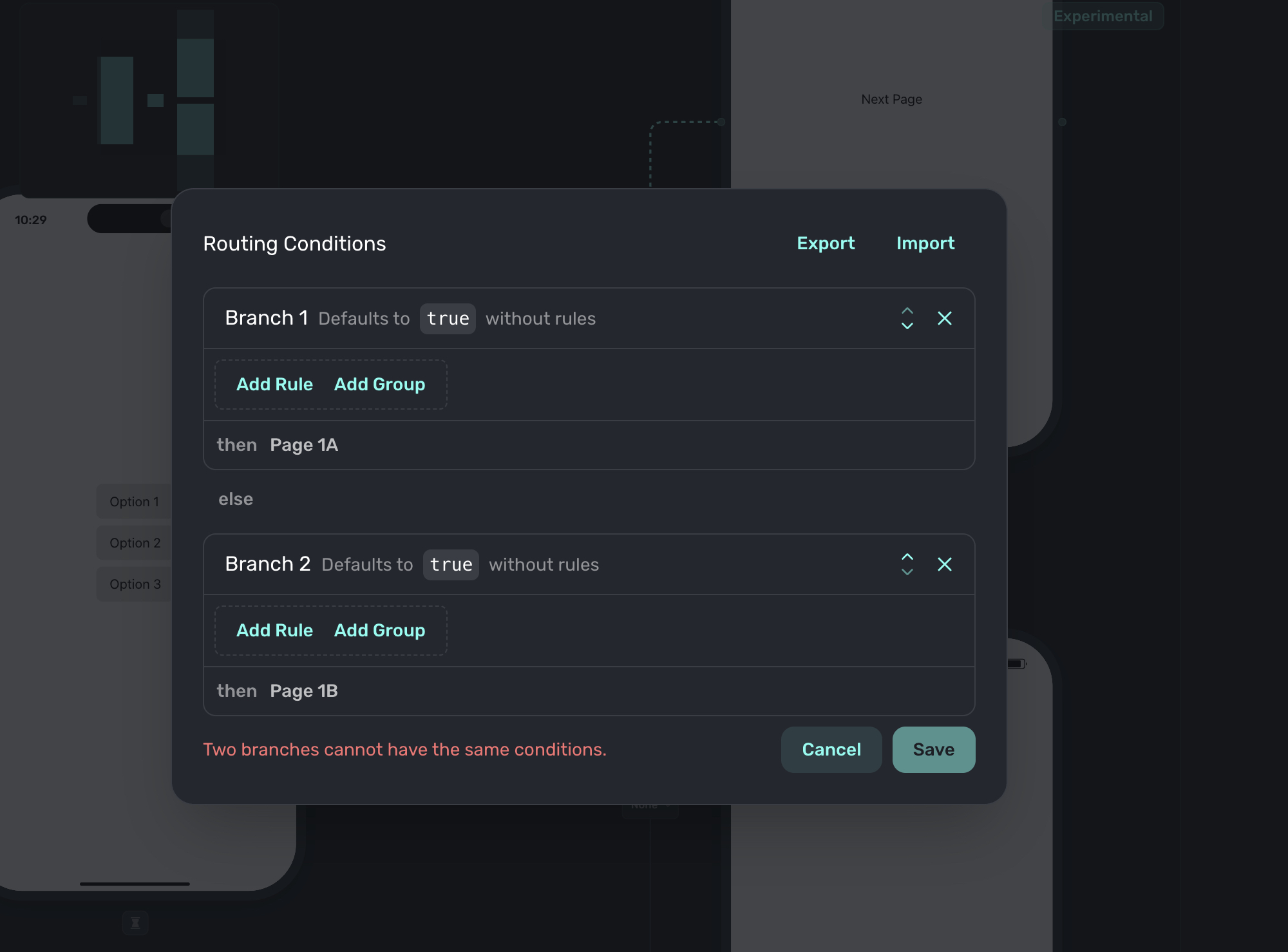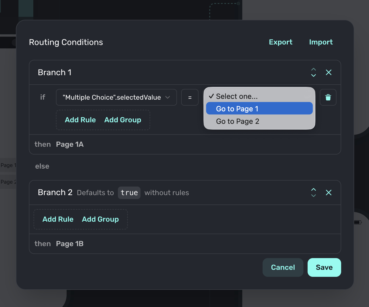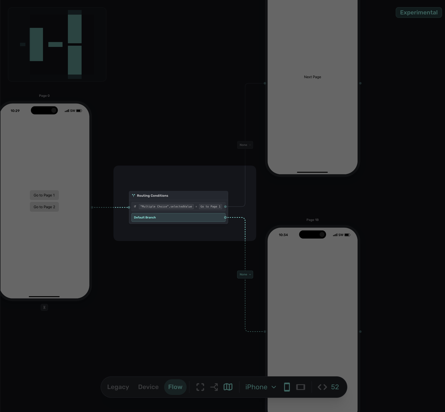 Routes can be conditional, meaning users can see different pages based on their input or attributes. This is the core of personalized flows. You might change the page that shows next based off a multiple choice answer, or certain component tapped, etc.