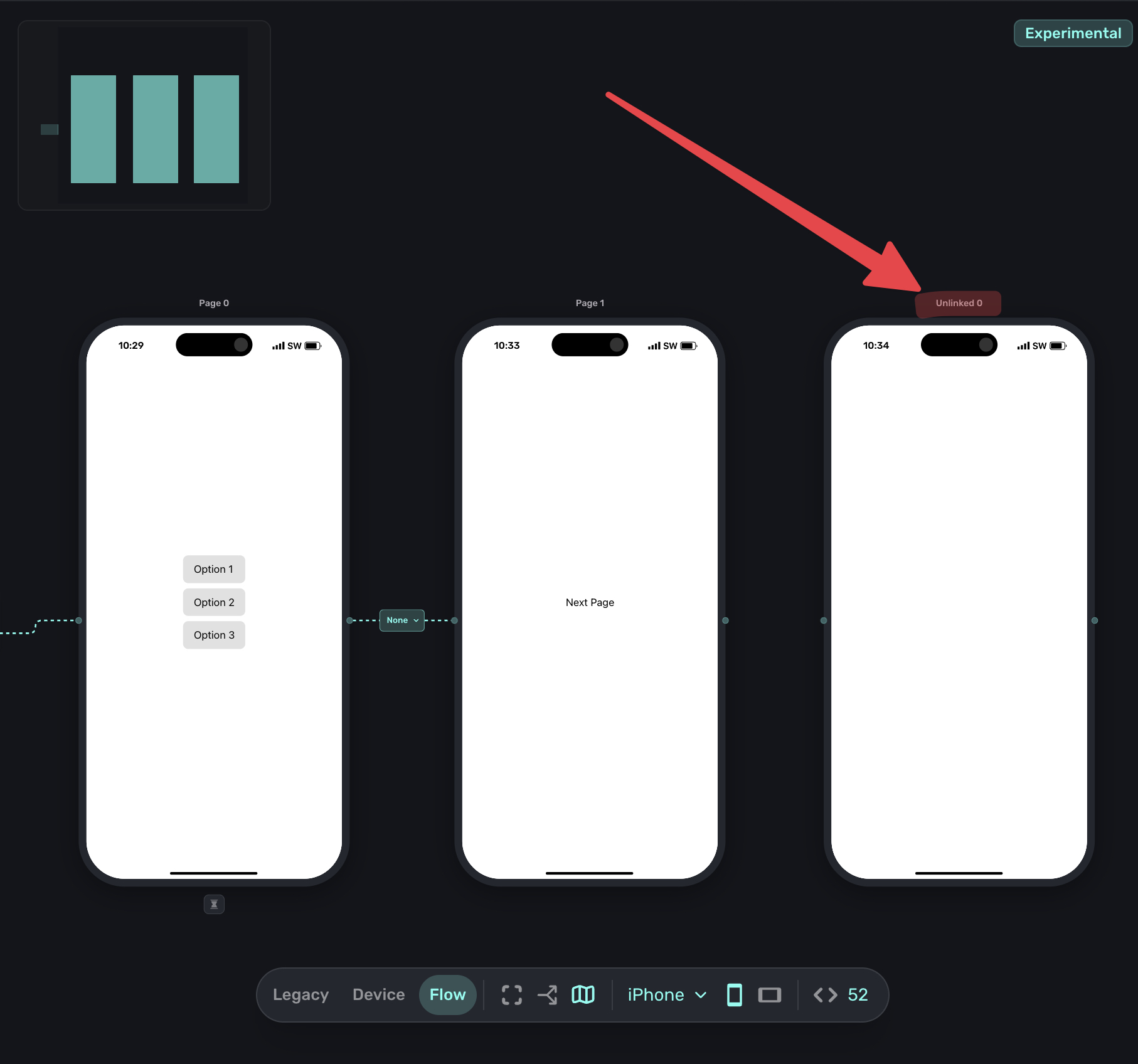 Pages that aren't connected to the flow show a label indicating they're unlinked. These pages won't appear in the user's journey until you connect them: