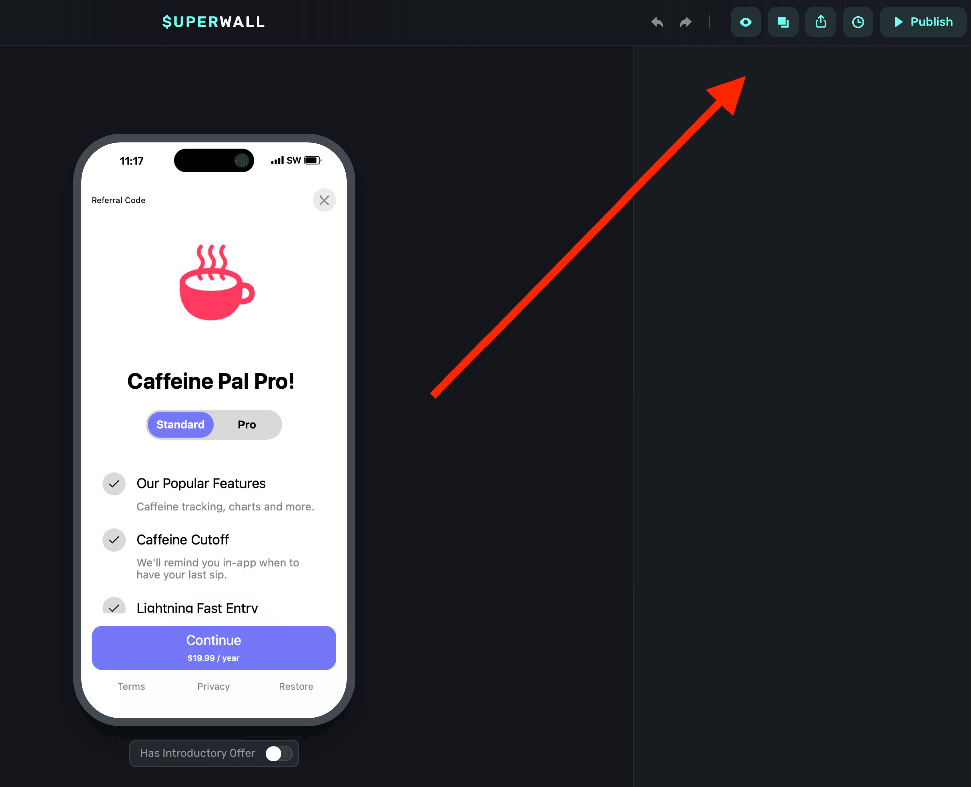 • History: View paywall edit history and revert to a previous version. See "Paywall history" below for more.