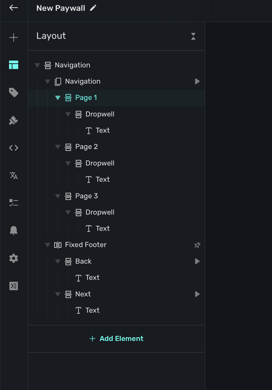 When a navigation element is added, Superwall automatically creates an element variable for it (accessed through the Variables tab in the left sidebar, or the variables button in the floating toolbar). Its name will match whatever is in the element hierarchy in the left sidebar: