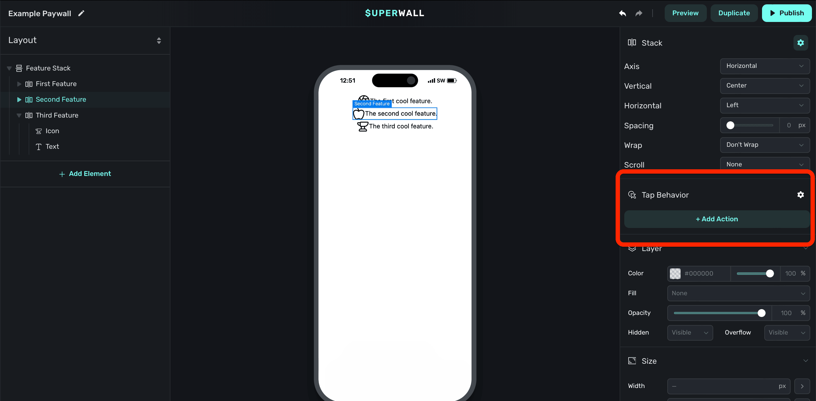 - Custom Action: Performs a custom action that you specify. Using custom actions, you can tie application logic to anything tapped or clicked on your paywall. Check out the docs here.