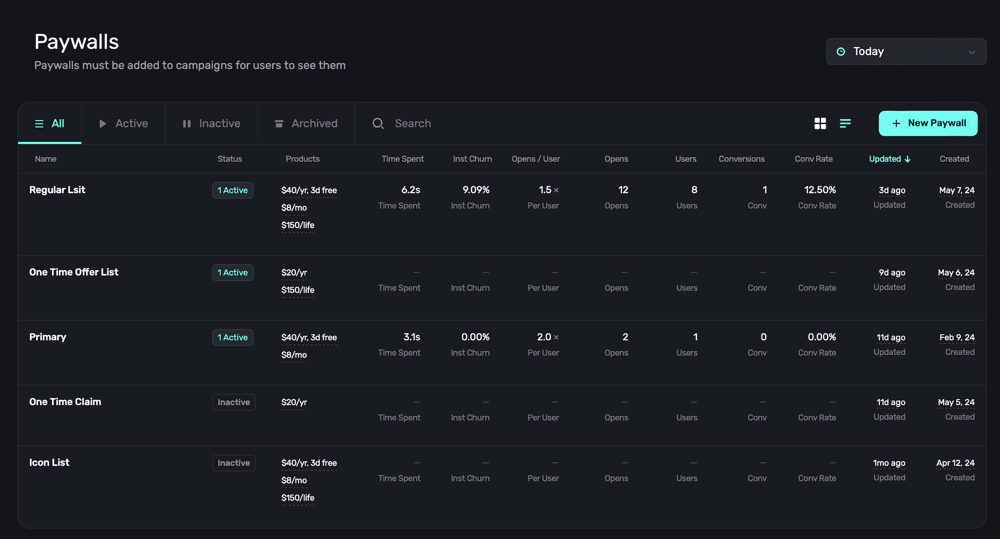 | Active | Paywalls that are currently being displayed and are live. |