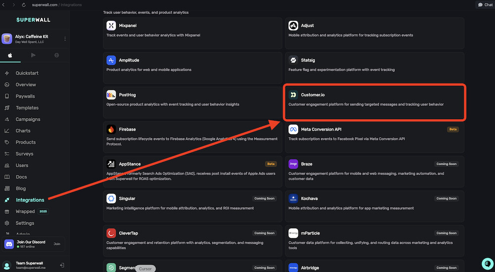 In the Communication section within Integrations, you can connect your Customer.io account to Superwall: