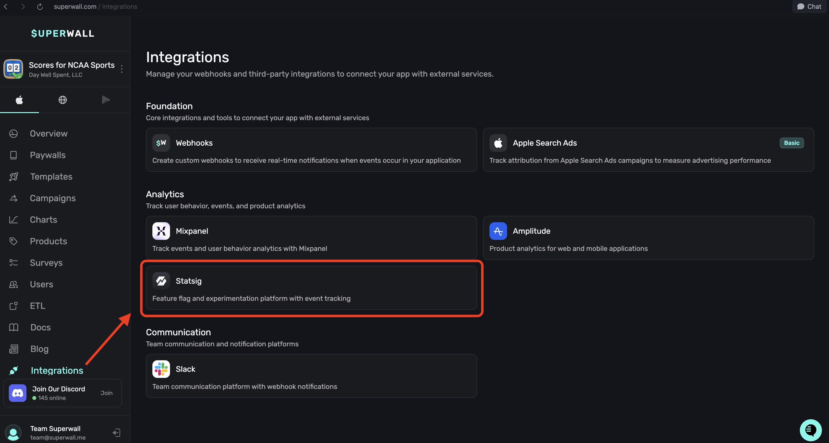 In the Analytics section within Integrations, you can connect your Statsig account to Superwall:
