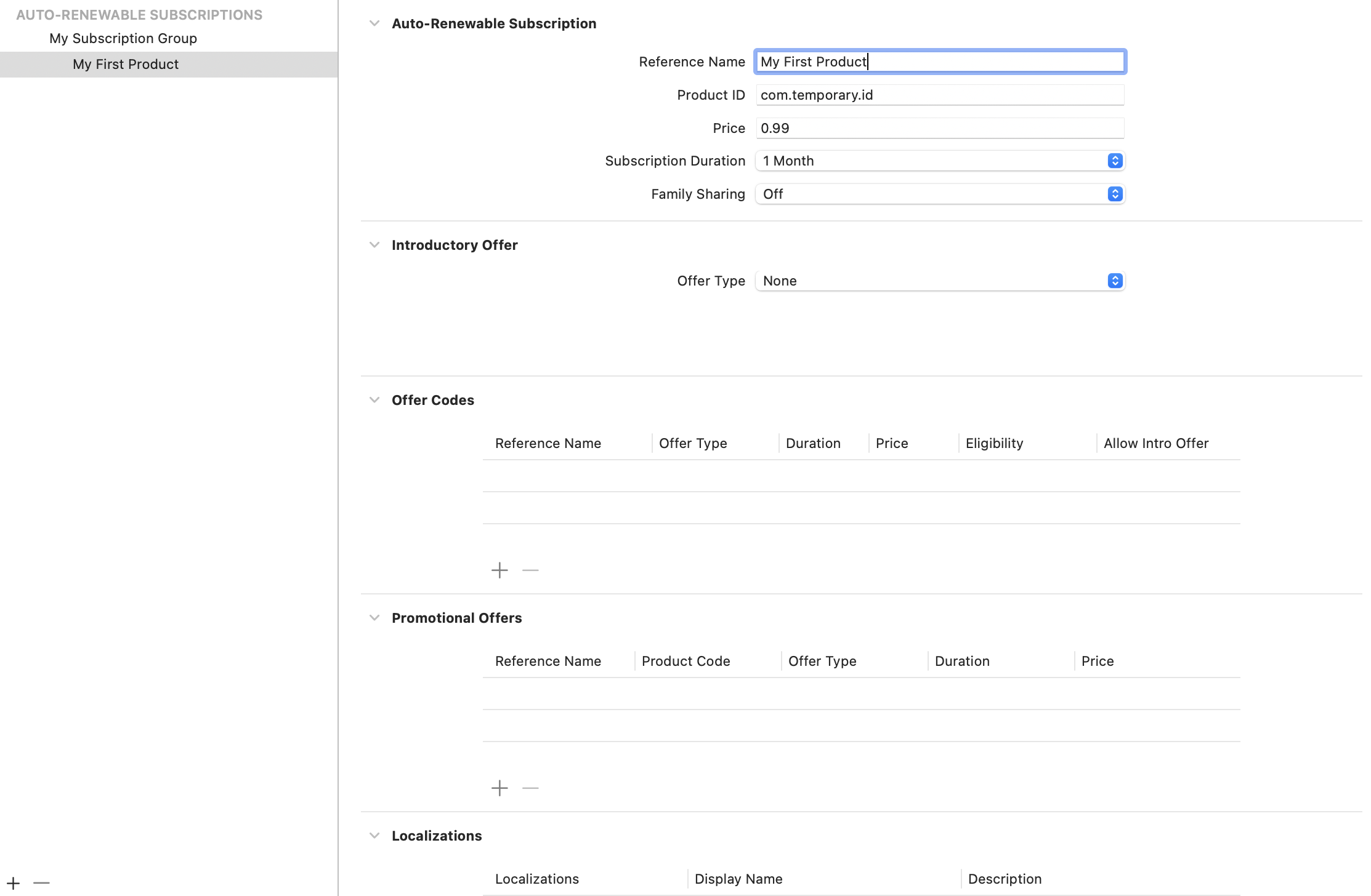 Configure the subscription as needed by filling in the Reference Name, Product ID, Price, Subscription Duration, and optionally an Introductory Offer. Again, this product doesn't have to exist in App Store Connect for you to test purchasing in the simulator. Here is a sample configuration: